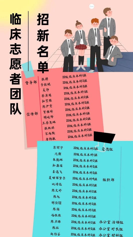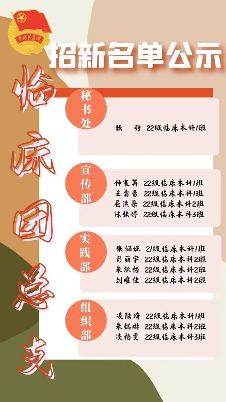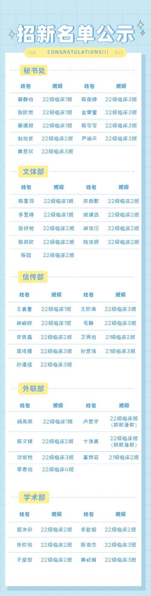 祝贺以上同学成为太阳成tyc122cc各组织的新成员!希望各位能够以全心全意服务同学为宗旨,策划举办更多同学们喜爱的活动,发挥公司与广大同学之间的桥梁和纽带作用,严于律己,开拓进取,共创一个更有凝聚力的临床员工会大家庭!
