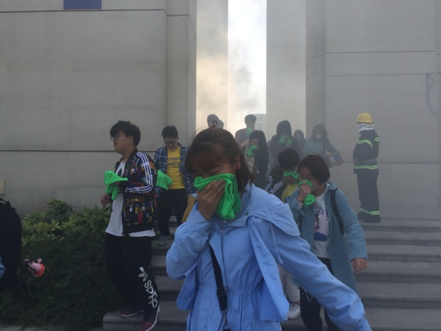 保卫处为保障此次活动的顺利进行,聘请了周浦消防中队的指导员,讲解如何预防火灾,以及发生火灾的情况下,同学们以何种态度面对和如何正确逃生。紧接着,为了模拟火灾现场,保卫处老师在走廊与教室中放入了烟雾弹。火灾警报声响起时,同学们用毛巾捂住口鼻,穿过浓厚的烟雾,切身体验了火灾逃生的真实情景,感受到了逃生时的紧迫感和危机感。最后,在南苑教学楼前,老师与同学们在消防员的指导下,掌握了灭火器的使用方法,自己拿起灭火器,扑灭了火盆。
