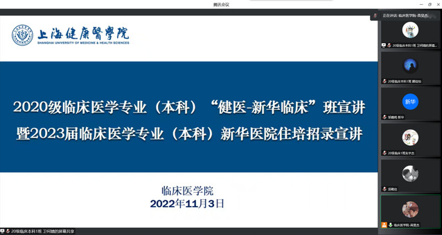 11月3日下午,2020级临床医学专业(本科)“健医-新华临床”班宣讲暨2023届临床医学专业(本科)新华医院住培招录宣讲顺利召开,交通大学医公司附属新华医院教务部、全科医学科、康复医学科、临床病理科、急诊科的负责人莅临此次会议会议由太阳成tyc122cc高旻杰老师主持。