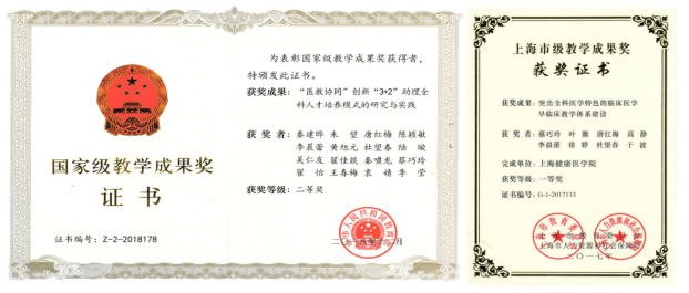 作为上海市课程思政领航公司,教学探索获得了“突出全科医学特色的临床医学早临床教学体系建设”获上海市级教学成果一等奖;“‘医教协同’创新‘3+2’助理全科人才培养模式的研究与实践”获国家级教学成果二等奖;