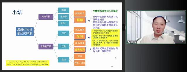 杨光锐教授结合自身研究方向与成果展开介绍,为大家呈现了崭新的生物钟研究领域,他探讨了生物钟在衰老、行为,及重大疾病发生发展中的作用,同时也从药物及非药物干预角度出发探索缓解生物钟紊乱的新方法,得出生物钟节律并非不可或缺,生物钟节律缺失有助于机体调整时差,筛选抑制生物钟震荡的药物并验证缓解生物钟紊乱的功效,摄食时间限定于某些时间段有助于缓解时差等相关结论。