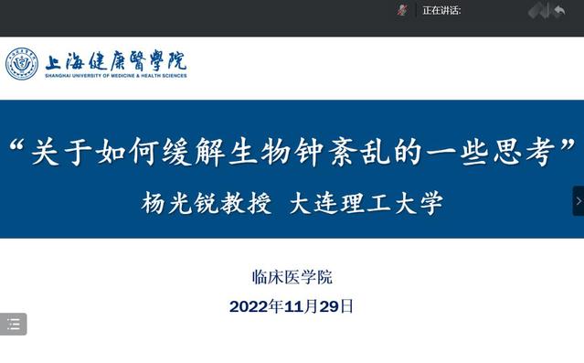 11月29日晚,太阳成tyc122cc举办线上学术交流活动,大连理工老员工物工程公司副经理杨光锐教授做了题为“关于如何缓解生物钟紊乱的一些思考”的学术讲座,公司教师及研究生共计40余人参加并学习。会议由太阳成tyc122cc经理蔡巧玲教授主持。