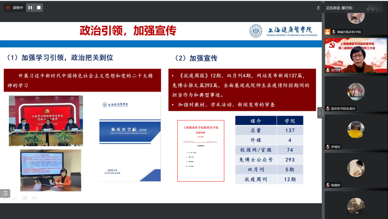 党总支书记、经理蔡巧玲从12个方面(“专业建设与公司发展”、“党建引领,立德树人,服务需求,融合发展”、“政治引领,加强宣传”、“担当作为,打赢校园疫情防控保卫战力”、“人才培养,需求导向”、“以评促建,推进本科教学合格评估”、“团队建设与科学研究”、“引育并举,加强人才队伍”、“国际交流与合作”、“员工教育与服务”、“支持喀什,援疆扶贫”、“按预算完成全年经费使用”)对2022年公司主要工作进行了全面回顾,内容详实、客观全面、实事求是。从六个方面(本科教学合格评估、临床医学专业论证、临床医学专业硕士学位点建设、全科医学团队建设、团队队伍综合能力培养以及教学能力培训、公司内部治理)对2023年工作进行了部署,目标明确,路径清晰,具有很强的指导意义。她还代表公司班子,感谢全体教职工对一年来对公司工作的支持和奉献。