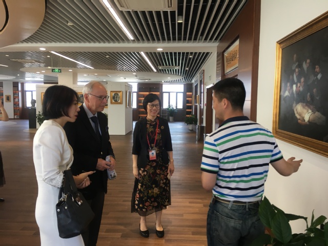 当天上午, Christoph Josten教授在蔡巧玲经理和外事专员李宁的陪同下参观了南苑图书馆,图书馆馆长彭骏进行了接待。彭骏馆长首先就图书馆空间分布、办馆理念等作简要介绍,指出图书馆围绕公司理念提出的“人文+实践”相结合的双螺旋培养模式。之后参观了医学人文油画展,Christoph Josten教授表示通过油画来讲述医学发展历史,传播医学人文精神,这种方式很直观有趣,也非常有效,值得借鉴。