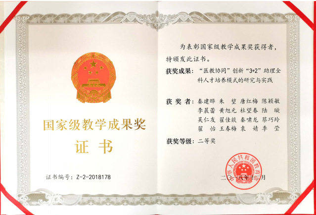 根据教育部公布的《关于批准2018年国家级教学成果奖获奖项目的决定》(教师〔2018〕21号),由公司牵头、嘉定区卫健委、嘉定区中心医院共同探索实践的《“医教协同”创新“3+2”助理全科人才培养模式的研究与实践》项目获2018年国家级教学成果奖二等奖。秦建晔、朱堃、唐红梅等16位项目团队成员获奖。