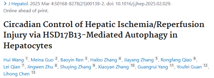 原文链接:https://authors.elsevier.com/sd/article/S0168-8278(25)00138-2. Wang, H., Guo, M., Ren, B., et al. Circadian Control of Hepatic Ischemia/Reperfusion Injury via HSD17B13-Mediated Autophagy in Hepatocytes. J Hepatol. 2025 Mar 4: S0168-8278(25)00138-2.