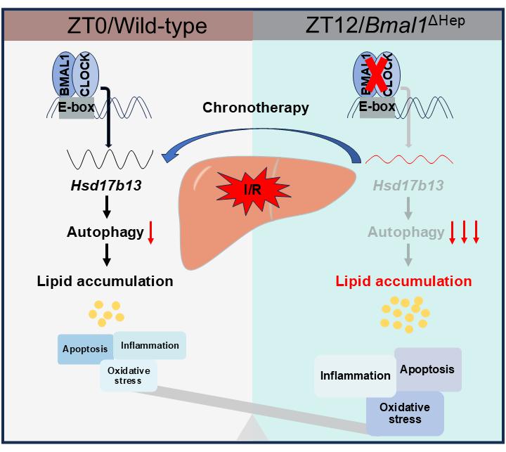 肝脏缺血/再灌注损伤(Hepatic Ischemia/Reperfusion Injury, HIRI)是肝移植和肝脏手术中常见的并发症,严重影响器官功能,增加移植失败和肝功能障碍的风险。尽管医学界不断探索,但针对HIRI的有效干预方法仍然匮乏。近年来,有研究提示HIRI的发生和严重程度存在明显的昼夜节律差异,即在一天中的不同时间点进行手术,发生HIRI后的肝脏损伤程度和预后会大相径庭。然而,关于这一现象的具体机制仍不完全清楚。