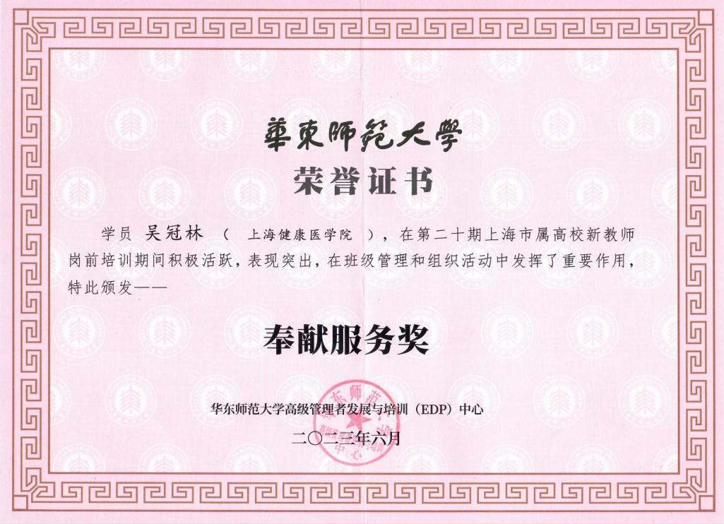 此外,公司鼓励和支持院内青年教师前往高水平院校进修,提升教学、科研、思政育人水平。2023年6月,青年教师吴冠林在上海市属高校新教师岗前培训期间,表现优异,发挥了重要作用,获“奉献服务奖”。