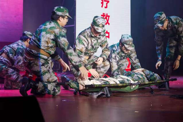 本次军事技能比武大赛,公司作为上海市唯一一所参加展示的医公司校,在校学工部的支持和浦东新区人民医院急症科万健主任、诸海军副主任医师的指导下,给予7名在读急救班医员工系统的培训和指导。战场医疗救护技术包括止血、包扎、固定、搬运、心肺复苏术等,员工按照模拟战地情景,生动演绎了战地现场伤员的紧急医疗救护。剧情中,两名队员在战火中负伤,分别致头部外伤及下肢骨折。其余五名队友在相互掩护后,将伤员转移至掩体后方相对安全区域,利用他们的专业战地急救技术对伤员进行初步止血、包扎及固定,同时完成安全转运。战地现场医疗救护的意义在于,可有效减少伤员的死亡及致残率,提升战斗力,巩固战斗意志。
