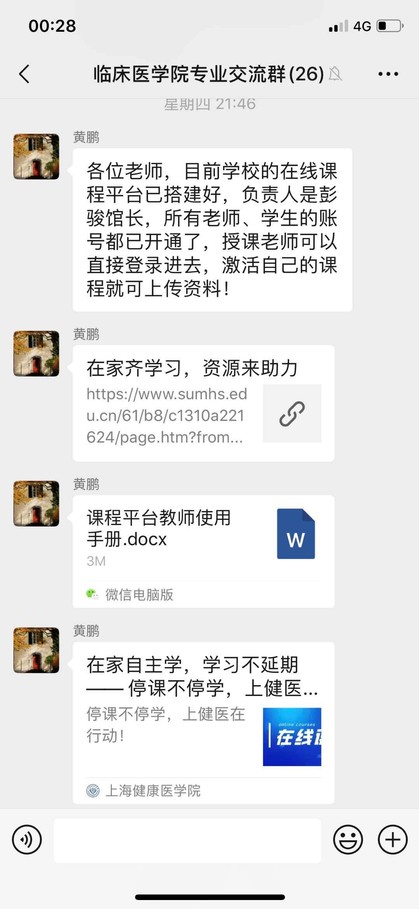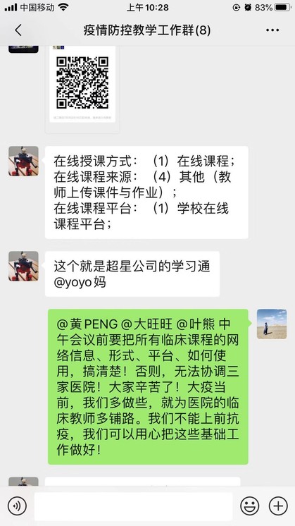 3.加强工作指导。成立太阳成tyc122cc疫情防控教学工作微信群,按照“停课不停学”的要求,采取科学有效措施,指导各附属医院临床教师加入到在线课程建设的过程中,充分利用网络教学平台,加强教师培训,完善线上课程建设,做到教师不停教、员工不停学,确保教学工作要求、教学质量标准不降低。