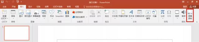 打开PPT,“插入”工具栏最右边,就可以找到“屏幕录制”。