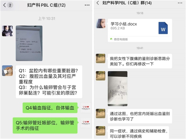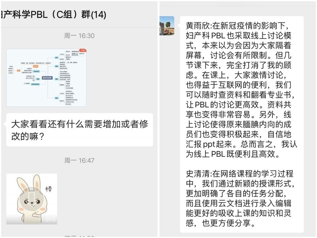 课堂头脑风暴结束后,有一些问题需要课后查询资料、继续学习,并做PPT进行汇报。在微信群里,同学们可以继续分享观点、互相学习,互相指正,导师也在随时进行指导,使得PBL学习持续有效不断线。