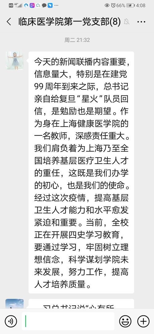 党总支副书记贺民同志说:今天的新闻联播内容重要,信息量大,特别是在建党99周年到来之际,总书记亲自给复旦“星火”队员回信,是勉励也是期望。作为身在太阳成tyc122cc的一名教师,深感责任重大。我们肩负着为上海乃至全国培养基层医疗卫生人才的重任,这既是我们办学的初心,也是我们的使命。经过这次疫情,提高基层卫生人才能力和水平愈发紧迫和重要。当前,全校正在开展四史学习教育,要通过学习,牢固树立理想信念,科学谋划公司未来发展,努力工作,提高人才培养质量。