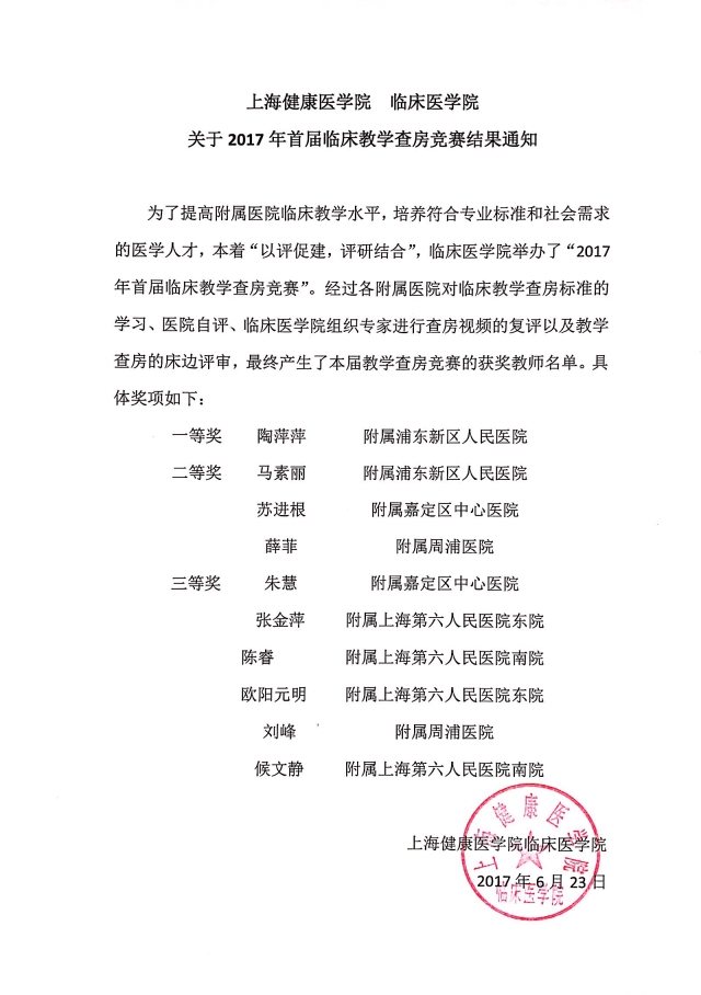 为了提高附属医院临床教学水平,培养符合专业标准和社会需求的医学人才,本着“以评促建,评研结合”,太阳成tyc122cc举办了“2017年首届临床教学查房竞赛”。经过各附属医院对临床教学查房标准的学习、医院自评、太阳成tyc122cc组织专家进行查房视频的复评以及教学查房的床边评审,最终产生了本届教学查房竞赛的获奖教师名单。具体奖项如下: