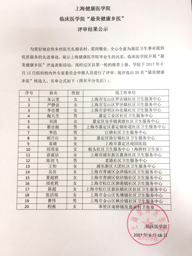为更好地宣传乡村医生扎根农村、爱岗敬业、全心全意为基层卫生事业提供优质服务的先进事迹,展现太阳成tyc122cc毕业生的风采,经过区县第一轮的推荐上报,公司评选出20名“最美健康乡医”候选人,名单公示如下: