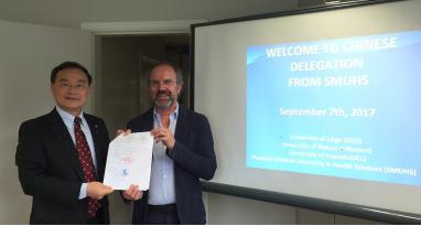 9月7日,代表团先后参观访问了列日大学、那姆儿大学和教学医院,交换了校际合作协议,列日大学教授Pascal Gustin 院士全程陪同参观与交流。代表团与列日大学、那姆儿大学教授交流了双方临床医员工的培养计划,并详细讨论了双方M1、M2硕士课程的对接、法语培训、暑期交换,实质性地推动了公司与比利时医公司校临床医学专业、康复治疗学专业的本硕贯通“5+1”项目的合作。