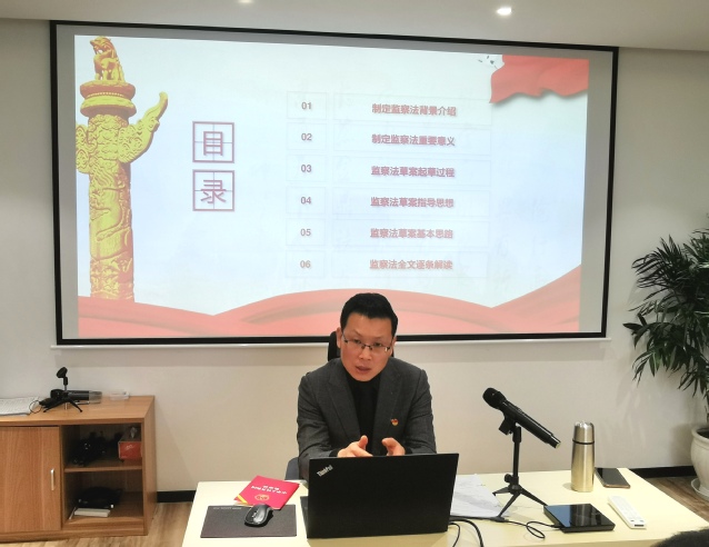 参观结束后,大家来到廉政文化馆会议室,黄鹏副经理带领大家领学了《中华人民共和国监察法》,他围绕监察法背景介绍、指导思想和全文三个方面进行导读。制定监察法是贯彻落实党中央关于深化国家监察体制改革决策部署的重大举措,对于创新和完善国家监察制度,实现立法与改革相衔接,以法治思维和法治方式开展反腐败工作,意义重大、影响深远。对推进国家治理体系和治理能力现代化具有深远意义。