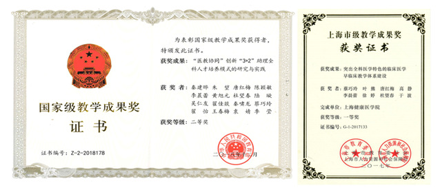 “创新‘3+2’助理全科人才培养模式的研究与实践”项目获国家教学成果二等奖、上海市教学成果特等奖。