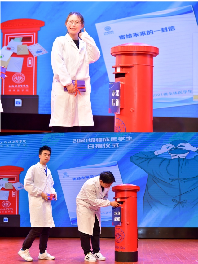 在附属嘉定区中心医院许向东主任的带领下,庄严宣誓医员工誓言。白袍加身,使命传承,矢志誓言,铿锵有力,医员工们以积极昂扬的精神面貌,表达了献身医学的决心与不懈奋斗的信念,在这神圣的专业仪式教育中完成了精神洗礼和角色转变,向医学专业学习生涯迈出了第一步。同学们带着对未来的展望,将写给五年后自己的一封信投入“时空胶囊”。相信在同学们的努力奋斗下,一定会成就未来更好的自己。仪式在全体师生大合影中落下帷幕。