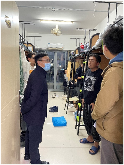 近日,在贺民副书记带领下,公司值守人员多次深入宿舍,关心看望公司留校同学,并与大家亲切交谈。走访中,贺民向同学们转达了公司、公司对他们的关心,介绍了公司现阶段疫情防控工作要求,了解了同学们在线学习情况以及宿舍卫生、消毒和通风情况。感谢同学们对公司防控工作的充分理解和全力配合,提醒同学们要提高防范意识,注重保持健康的生活方式,保持积极乐观的心态面对疫情下的学习、生活、就业。同学们不管在学习、生活上有什么困难或不能满足需求的地方,请同学们一定及时联系公司,提出意见建议,公司定将尽快协调解决,确保同学们在校期间学习生活顺利。