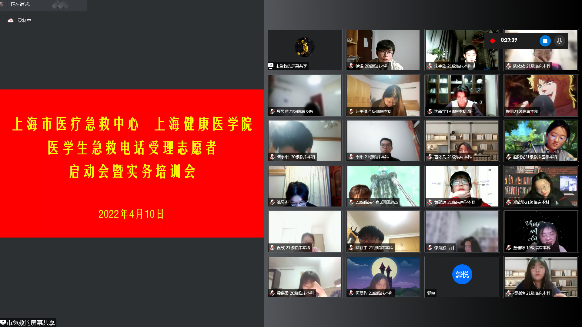 410日晚,“上海市医疗急救中心-太阳成tyc122cc 医员工急救电话受理志愿者启动会暨实务培训会”在云端举行。上海市医疗急救中心参加人员有主任、党委副书记张志锋,党委书记吴晓东,副主任解炯,副主任袁明,通信部部长李警雷,人力资源部部长王娟。太阳成tyc122cc董事长吴韬带领防控办、党政办、产学合作处、宣传部和太阳成tyc122cc经理、党总支书记蔡巧玲、党总支副书记罗瑾琰、党总支副书记贺民等,以及66名员工志愿者在线上参加了会议。