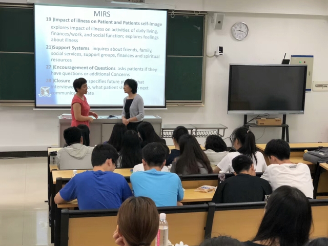 6月20日上午,Prof.Doris Young17级临床医学专业员工介绍了澳大利亚全科医生的(GP)岗位职责,并指出全科医学是全人的学科,医生眼中不能只有疾病,更重要的是要有病人。课程的内容非常丰富,还基于案例讲述了如何进行良好的医患沟通。Prof.Doris Young在给16级临床医学专业同学的讲座中,深入讲解了医患沟通的具体原则即MASTER INTERVIEW RATING SCALE(MIRS)。教授以两个情景案例真实地还原了问诊的全过程恰当的语速、温和的态度以及适当的语气、姿势等给予同学们非常直观地感受从开始到结束无不体现出对病人的尊重、关注与关心。来自墨尔本大学医公司三年级MD员工陈新叶同学和杜望春老师参与了角色扮演陈新叶同学还给公司临床专业员工分享了她在墨尔本大学的学习经验。