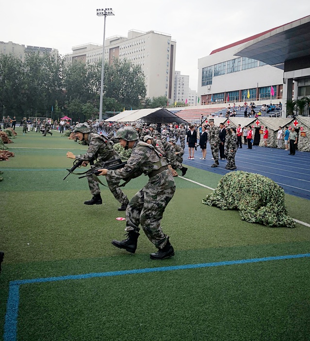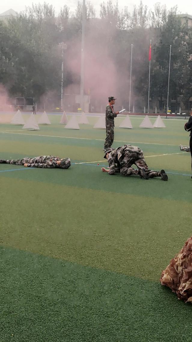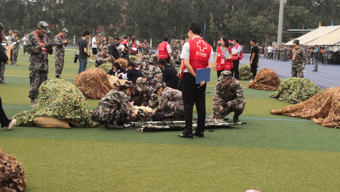 终于,7月12日迎来了正式的展示比赛。天公作美,北京的暴雨未如期而至,但操场仍然潮湿光滑。随着一阵阵枪炮声,狼烟四起,平原作战部队发起了进攻,模拟战场上一个个战士手端冲锋枪,突然我方2名队员受伤倒地。4名救护队员冒着枪林弹雨,身背急救包,手抬担架,屈身来到掩体后进行救援。1名男救护队员匍匐行进在大雨过后的草地上,3名女救护队员在掩体后紧张地进行伤员救治。争分夺秒地完成战场就地紧急救治后,4名救护队员以最快的速度用担架将伤员送回野战医疗救护所。展示完毕,公司6名同学在规定时间内圆满完成了所有任务,当他们列队汇报时,汗水在阳光下闪闪发光。