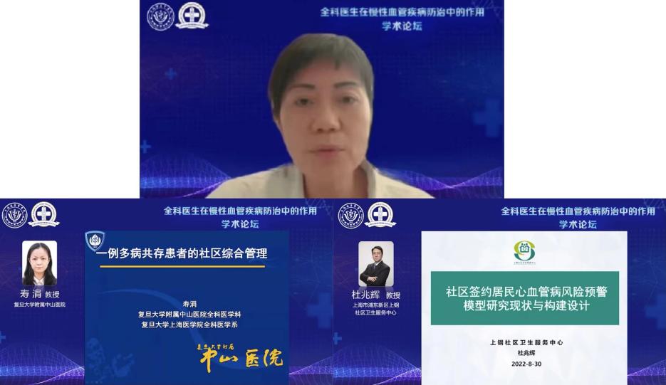 主旨报告环节由上海交通大学附属新华医院全科医学科费爱华主任主持。复旦大学附属中山医院全科医学科寿涓主任就一位多病共存患者的社区管理进行了精彩分享;浦东新区上钢社区卫生服务中心主任杜兆辉教授介绍了其团队正在研究的社区签约居民心血管风险预警模型。两位全科医生意在强调全科医学要以医疗为基础、以科研为引领,需提高补充专科医疗、多系统疾病共存的临床处理能力,临床医生要以临床问题为导向,推动临床研究问题的解决。